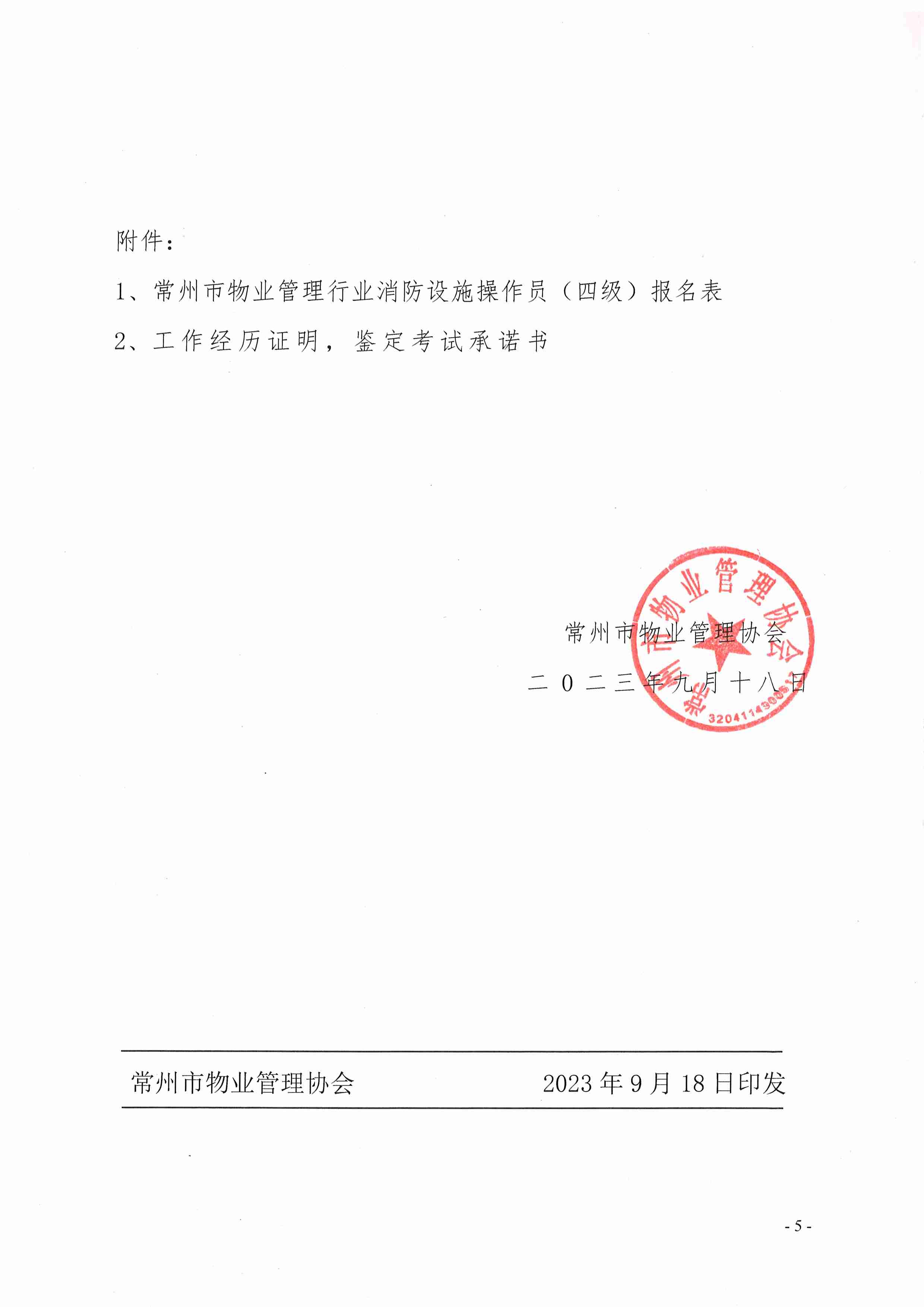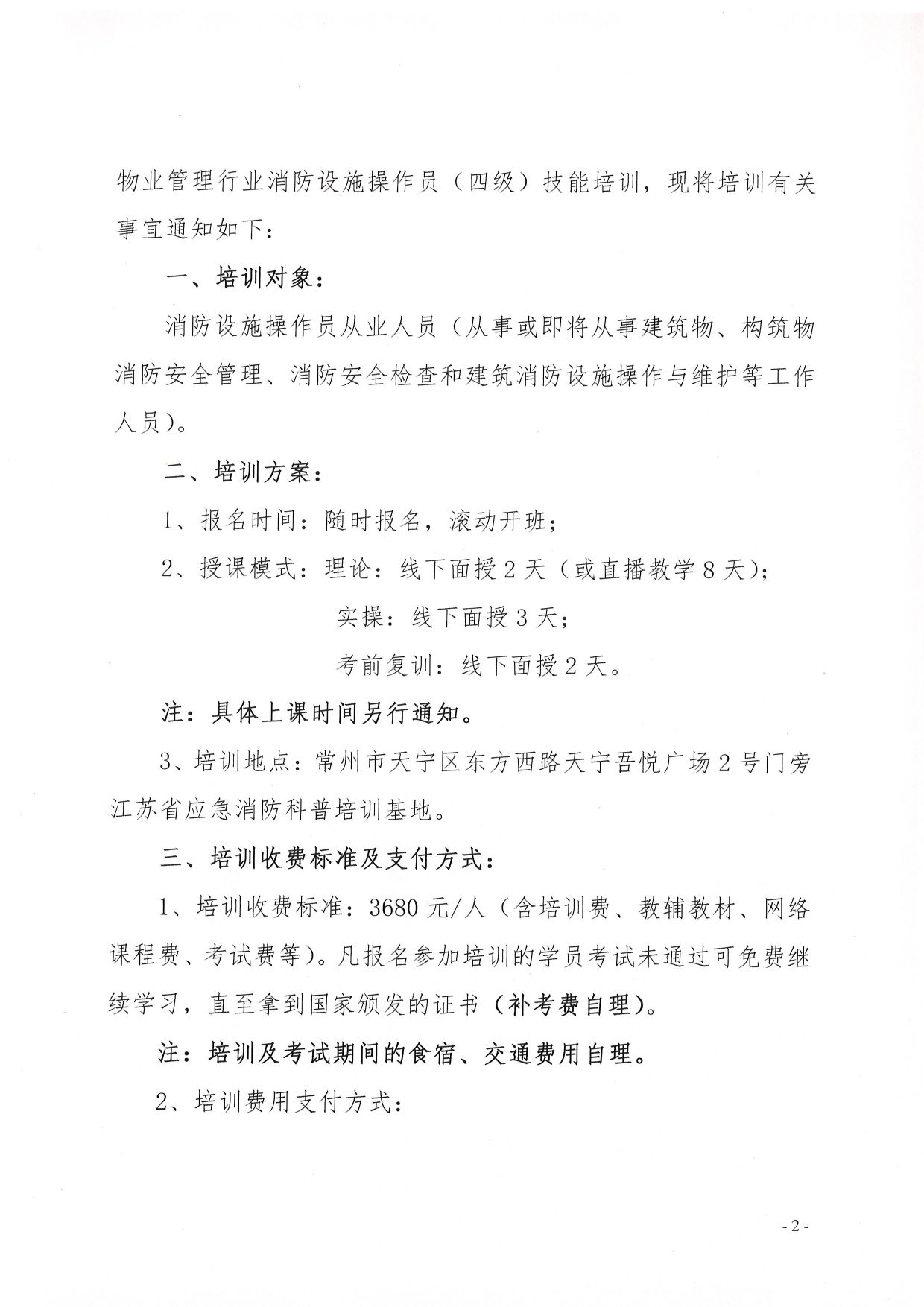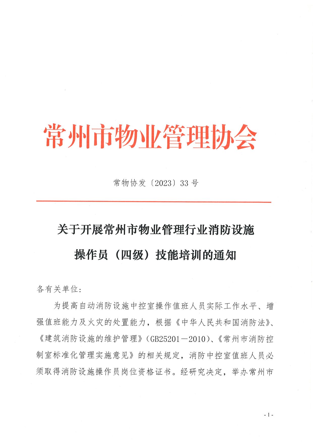 关于开展常州市物业管理行业消防设施操作员(四级)技能培训的通知